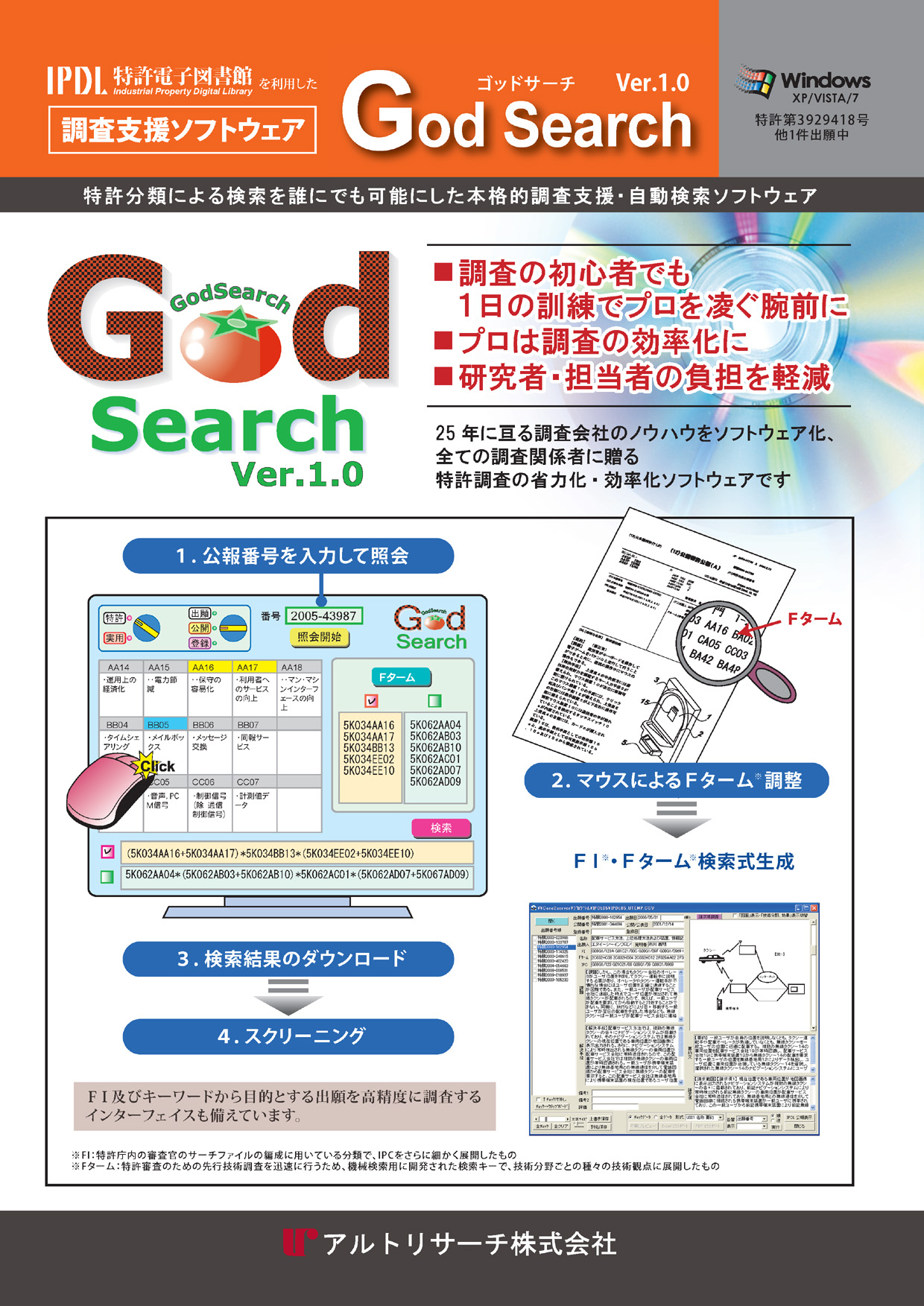 2012年10月25日 14:30アルトリサーチ株式会社(本社:東京都江東区、代表取締役:五十嵐 和信、以下 ULT社)は、特許電子図書館(IPDL)を利用した特許の検索自動化ソフトウェア GodSearch(ゴッドサーチ)の出荷を2012年11月1日より開始します。