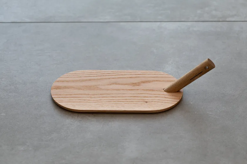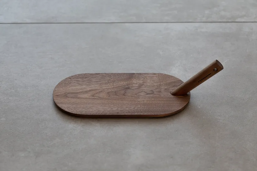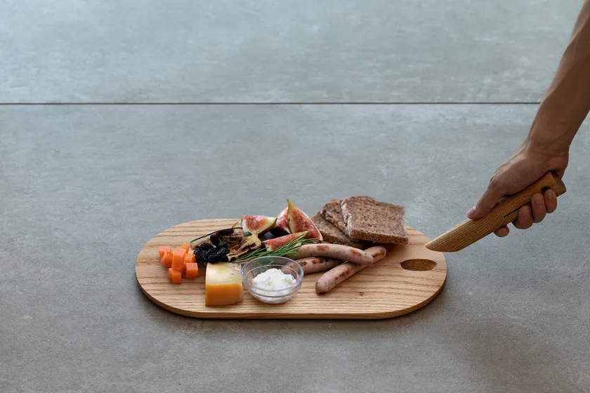 カッティングボードの穴にハンドルを抜き差しして簡単に着脱できる独自の構造を採用することで、持ち上げにくいという課題に応えました。手首に負担の掛かりにくい角度でハンドルを取り付けられるため、とても持ちやすく、料理を運んだあとはハンドルを取り外して、卓上スペースを広くお使いいただけます。