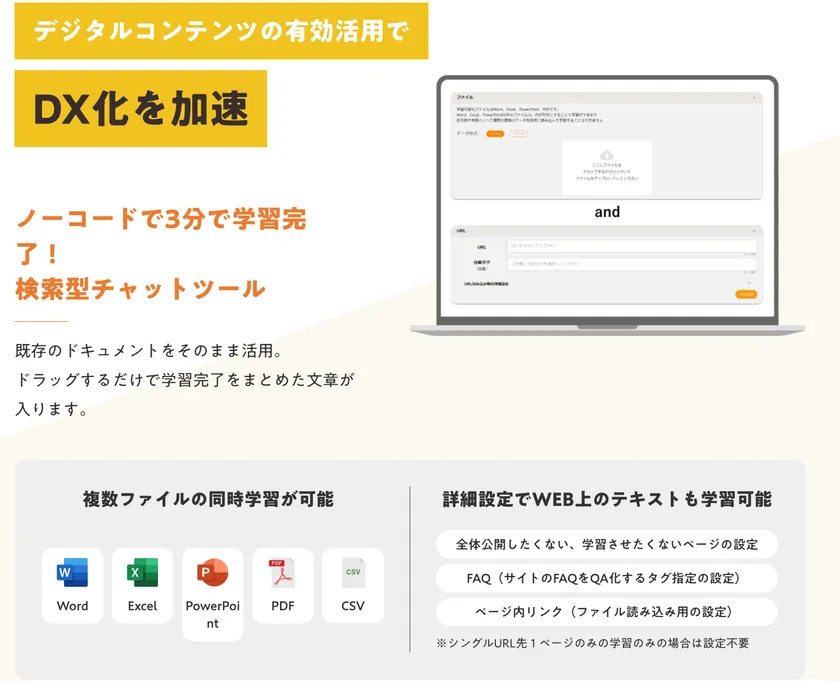また、ファイルだけではなくWebサイトを学習することも可能。そのため、従来のチャットボット製品と異なり、チャットボット用のFAQやシナリオを作成するなどの手間が大幅に軽減できます。