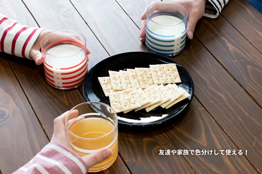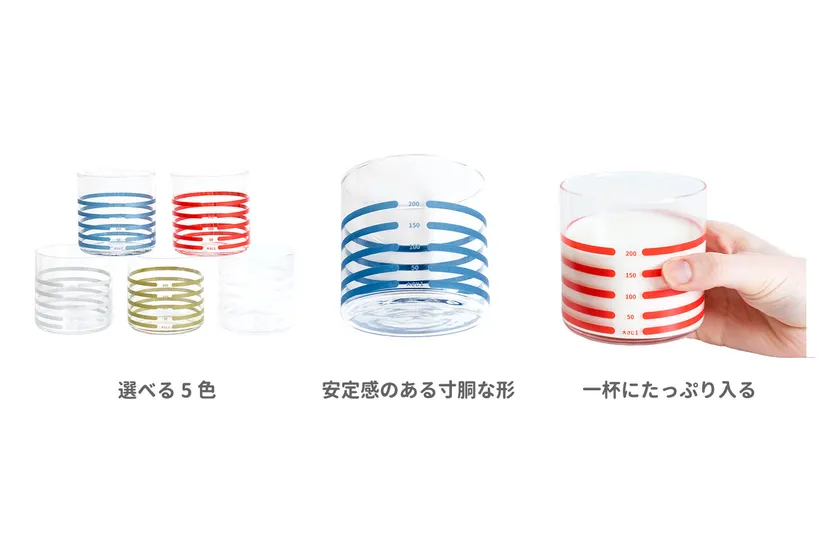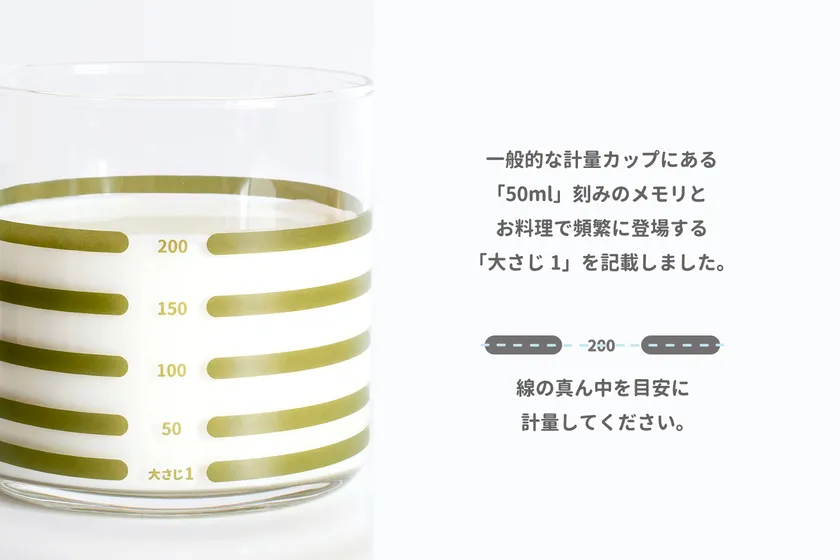 ボーダー柄のデザイン一本一本で、50ml刻みの分量を量ることができます。
