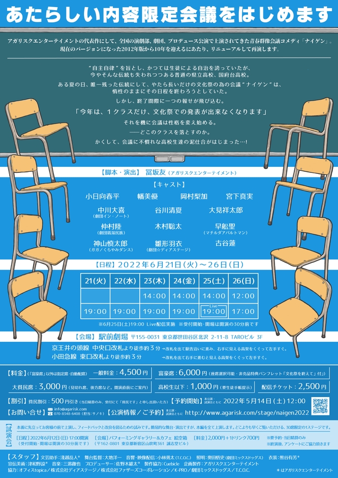 アガリスクエンターテイメントの代表作にして、様々な劇団、プロデュース公演、中学高校大学演劇部にて上演されてきた、会議コメディの新たなクラシック「ナイゲン」。