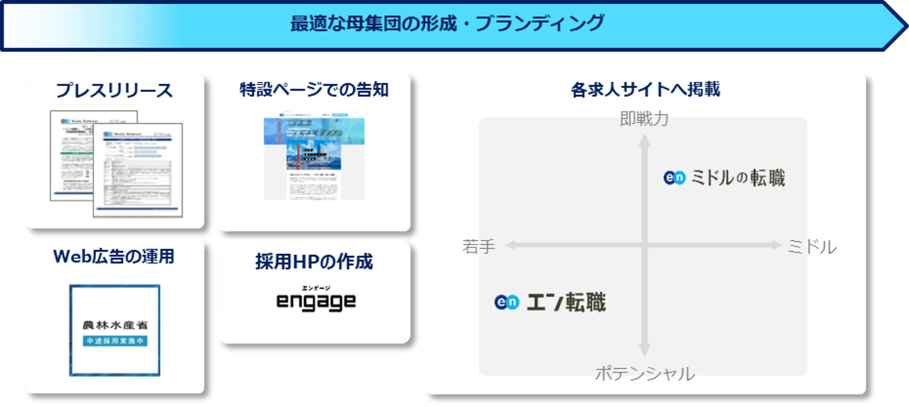 プレスリリースや特設ページ、採用HPの作成、Web広告を用いた告知に加え、各求人サイトでの集客サポートを実施。『エン転職』『AMBI』『ミドルの転職』とターゲットの異なる3つの求人サイトを活用することで、ターゲットへ網羅的に求人を届けました。また、採用ターゲットの策定から選考のアドバイスまで、全面的にサポートを行ないました。