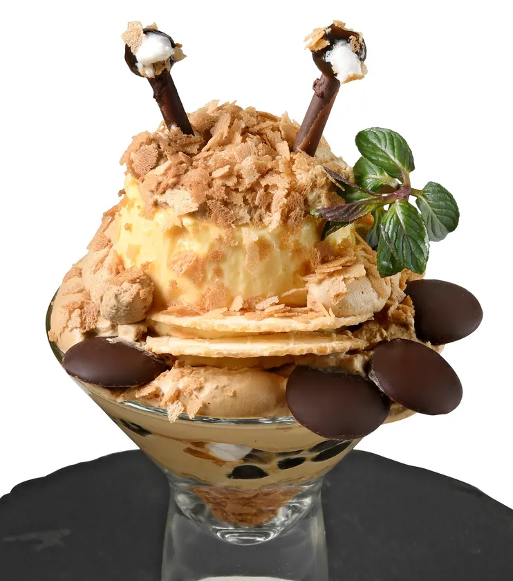 創業初期のレシピを再現したプリン。固めで昭和の懐かしい味。プリンをカネゴンそっくりにアレンジ。口の周りにはカネゴンの大好物のお金(チョコレート)を添えました。