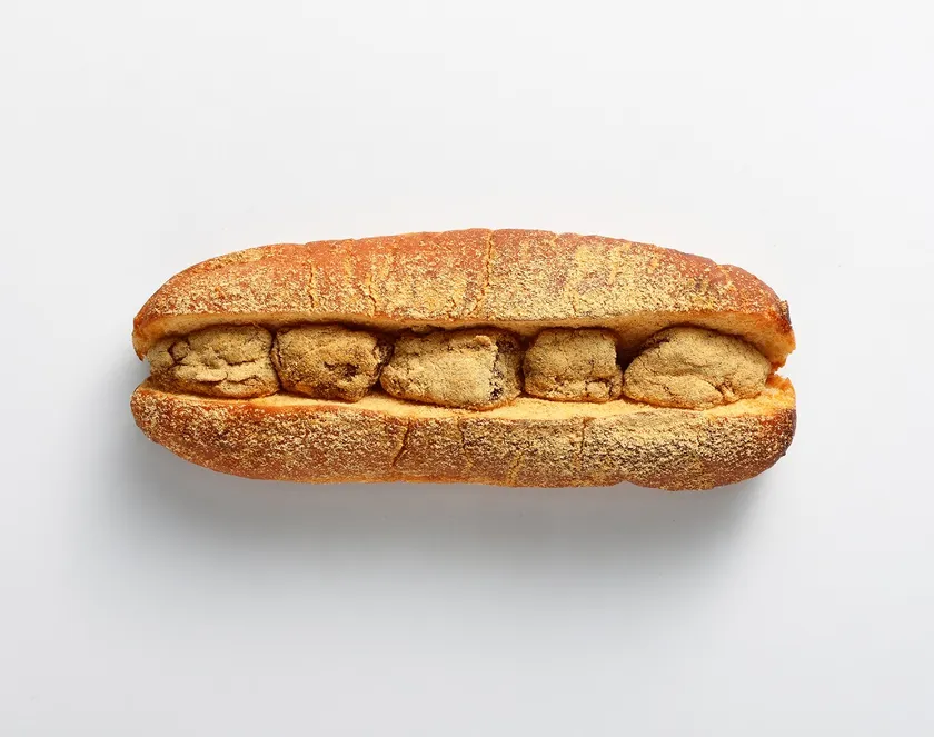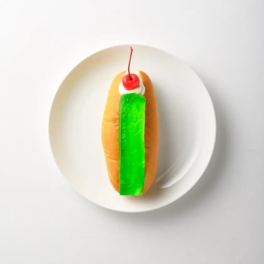 昔懐かしいメロンソーダをコッペパンにサンド。微炭酸のメロンソーダ風味のゼリーに、生カスタードを合わせたパン。食べるメロンソーダです。