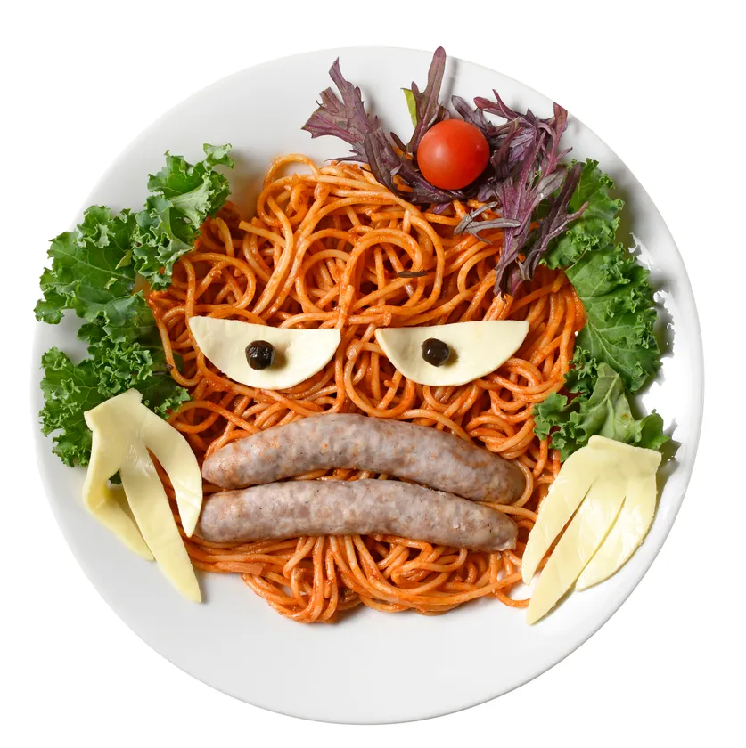 可愛い怪獣ピグモンをイメージした、ほんのり甘い懐かしい昭和のナポリタン。目と手はスライスチーズ、口はソーセージを使っています。