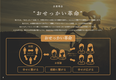 企業理念は「おせっかい革命」。「おせっかい」は「誰かを喜ばせてあげたい」「自分がしてもらったら嬉しいことを他の人にもしたい」という気持ちです。それはお客さまの感動や仲間の幸せへと繋がり、人と人との繋がりを生み出すと信じています。