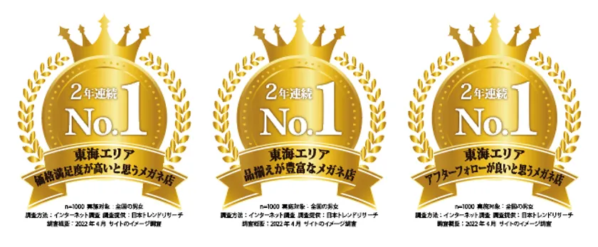 メガネ店についての調査において、中部オプチカル株式会社(所在地:名古屋市千種区、代表者名:宮本 洋石)の運営する『メガネ赤札堂』が、「東海エリア 価格満足度が高いと思うメガネ店」「東海エリア 品揃えが豊富なメガネ店」「東海エリア アフターフォローが良いと思うメガネ店」の3項目において第1位を獲得しました。