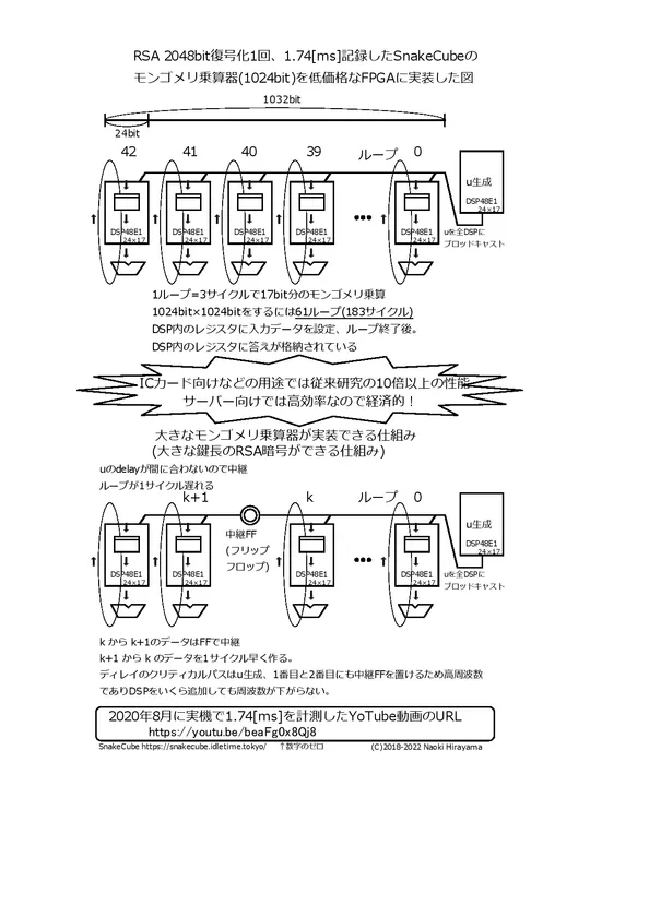 革新的な性能のモンゴメリ乗算器を持つ暗号プロセッサSnakeCubeは2018年に平山 直紀(Hirayama Naoki)によって発明され2020年にFPGAによる実機で高性能かつ高効率であることが実証されました。デバイス依存が少なく廉価なFPGAでも性能を発揮するため多くのデバイスに実装できる経済性の高い暗号プロセッサ。SnakeCubeは巨大な整数演算を得意としていますがSHA-2などのハッシュ演算では多大な無駄が発生します。SnakeCubeは1999年にRSA暗号の性能で世界一だった大型コンピュータ(IBM互換機)の暗号装置に搭載された暗号プロセッサICF3の設計者によるものです。