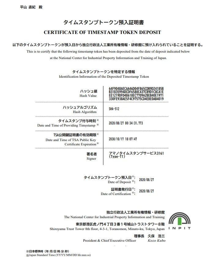 測定に使ったverilogのソースコードを独立行政法人工業所有権情報・研修館(INPIT)および世界知的所有権機関(WIPO)においてオンラインでタイムスタンプの証明書を取得しています。なお独立行政法人工業所有権情報・研修館(INPIT)のタイムスタンプ・サービスは2021年3月に終了していますが「アマノタイムスタンプサービス3161」は有効です。