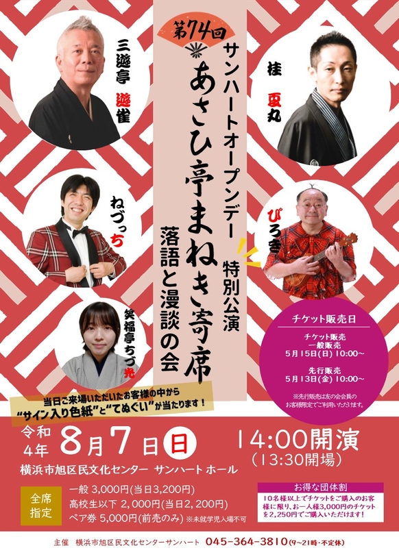 横浜市旭区民文化センターサンハート主催、落語と漫談の会『第74回あさひ亭まねき寄席』が2022年8月7日 (日)に横浜市旭区民文化センター サンハート ホール(神奈川県横浜市旭区)にて開催されます。チケットはカンフェティ(運営:ロングランプランニング株式会社、東京都新宿区、代表取締役:榑松 大剛)にて5月15日(日)10:00より発売開始です。