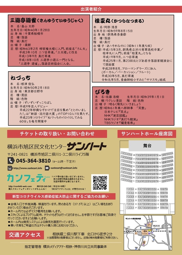 三遊亭遊雀・桂夏丸ほか 落語と漫談の会『第74回あさひ亭まねき寄席』横浜市旭区民文化センターサンハートにて開催決定 カンフェティでチケット発売