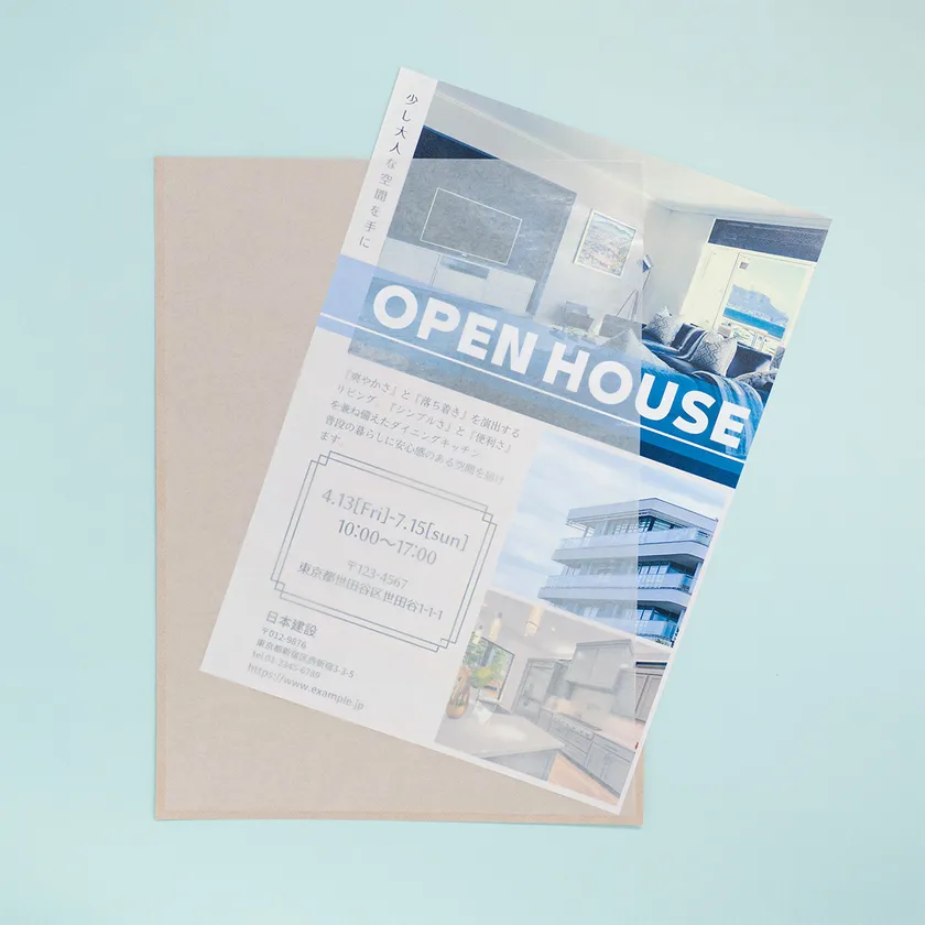 今までのプラスチック製クリアファイルの代わりに使用します。パンフレットやカタログ・資料などの印刷物を挟んで入れます。環境を重視したイベントなどで資料やパンフレットを配布する際に紙製クリアファイルを使用することで、環境配慮の訴求を高めることができます。
