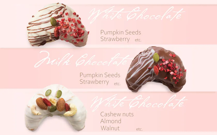 ・ホワイトストロベリー:ホワイトチョコレート×フリーズドライイチゴ、パンプキンシード等