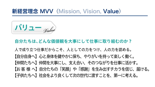<新経営理念体系「ミッション(Mission)、ビジョン(Vision)、バリュー(Value)」概要>
