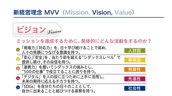 シダックス株式会社は、社内外の経営環境や事業ポートフォリオが大きく変化する中、今後もRe-Growth(再成長)を遂げていくためにグループ従業員が共通して目指すべき新たな旗印として、2022年度より、経営理念体系「ミッション(Mission)、ビジョン(Vision)、バリュー(Value)」(以下:MVV)を新たに制定しました。