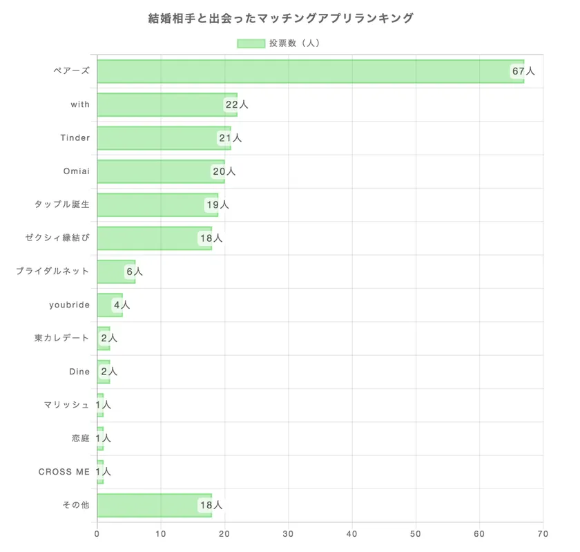 結婚相手と出会ったマッチングアプリ、経験者がおすすめするマッチングアプリとして、「ペアーズ」が1位という結果になった。