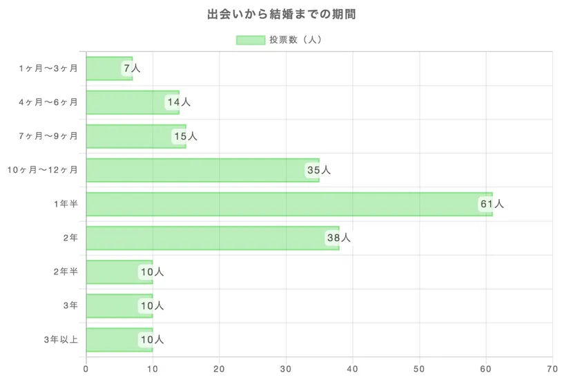 また、出会いから結婚までに至る期間で最も多かったのは、「1年半」。