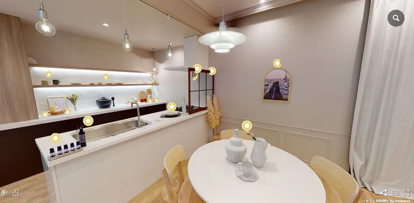 HEJはレンジフードを提案する際、顧客に対しレンジフードを持ち込み、対面での営業活動を行っておりましたが、コロナ禍という状況もあり、顧客へのアプローチ機会が減っている状況でした。そこで、新設するショールームをオンラインでも来場できる形式にし、対面・非対面どちらからでも来場を受け入れるようにします。オンラインショールームでは、クリックで自由に歩く方向を決めることができ、商品の前では、その商品の説明文や説明のための動画が閲覧できるようにします。