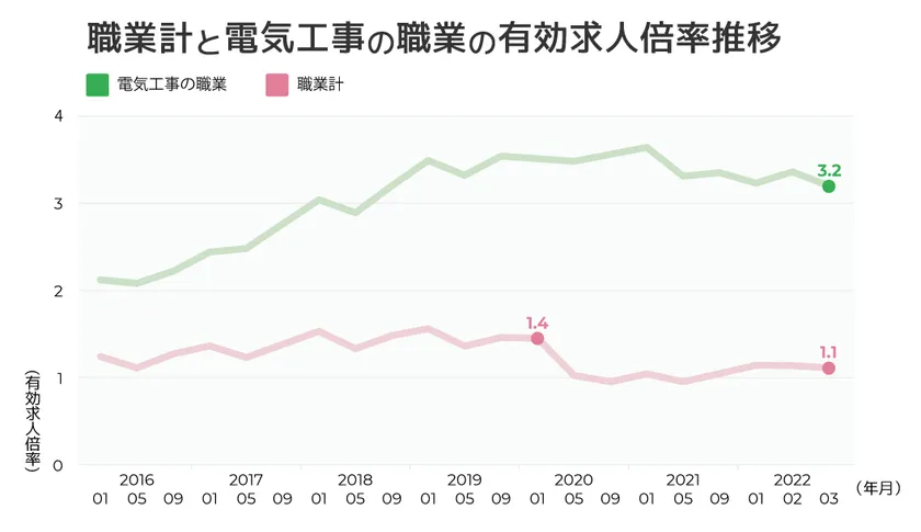 また、2022年3月の職業計と電気工事の職業の有効求人倍率推移を比較すると、電気工事の職業は3.2倍、職業計は1.1倍となり、電気工事の職業が【2.1ポイント高い】結果となりました。