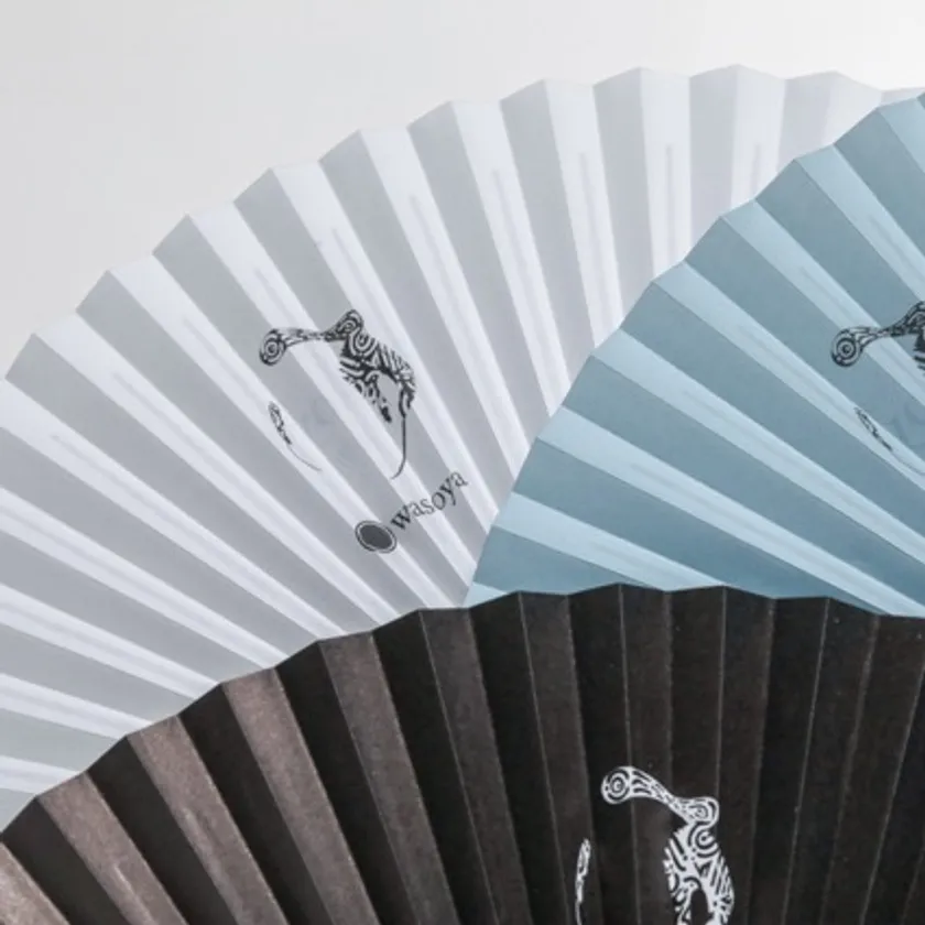 和想屋10周年のオリジナルロゴを中央にあしらった、シンプルなデザインの扇子です。落ち着いた唐木染の扇骨に、耐久性が高く破れにくい蝋引き紙を縫製。ロゴマークは和想屋10周年をテーマに、ペインターやショップデザイナーとして活躍するFront52dxが制作しました。持ち運びに便利な収納ケース付きで、グレー・ブルー・ブラックの3色展開。