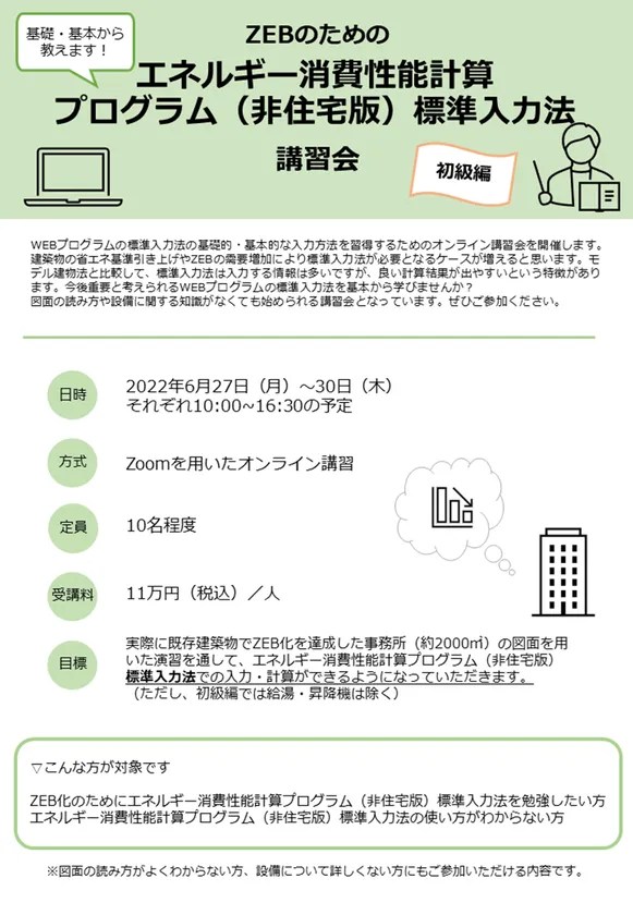 ZEBのためのエネルギー消費性能計算プログラム(非住宅版) 標準入力法講習会 初級編を6月27日~30日にオンラインにて開催