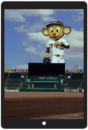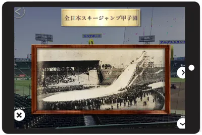 タブレットをグラウンドにかざすと、スコアボード、アルプススタンド、銀傘(ぎんさん)などの歴史の解説や古い写真が浮かび上がり、甲子園の歴史に触れることができます。