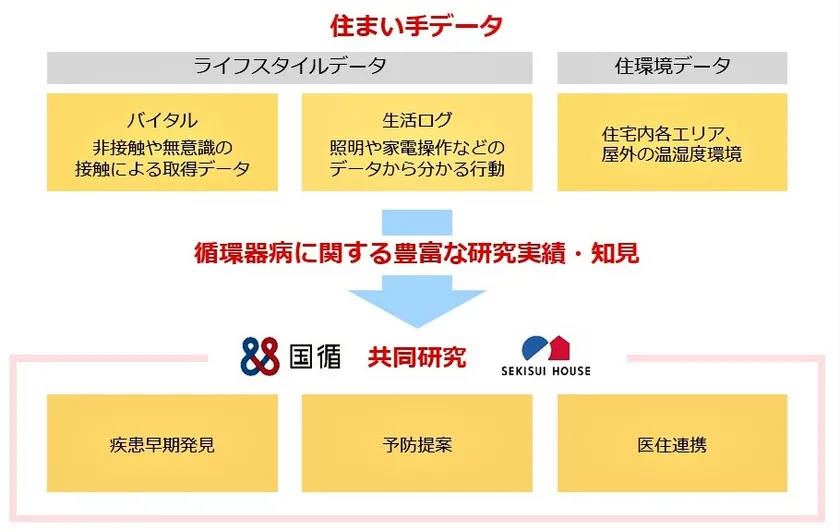 積水ハウスが取得する住まい手データ(ライフスタイルデータと住環境データ)と、国立循環器病研究センターが有する循環器病領域に関する豊富な研究実績、知見を最大限活用し、住まい手の健康に寄与するテーマの共同研究につなげます。