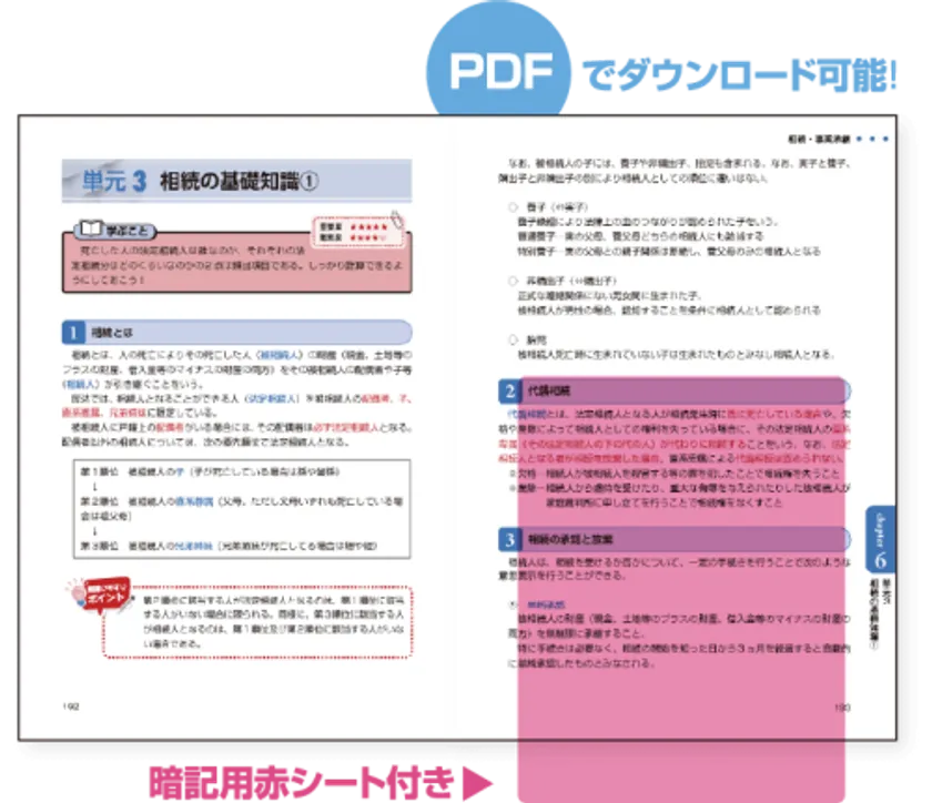 全ての教材は、製本版とPDFデータの両方で提供します。そのため、必要なページのみ印刷し、持ち運ぶことも可能です。アウトプットがたくさんできるよう、問題集は通常の問題集の他に総合テストの2種類をご用意。総合テストは解説講義付きで、問題の解き方も伝授するので、問題集をやったままにせず、解答までをサポートします。