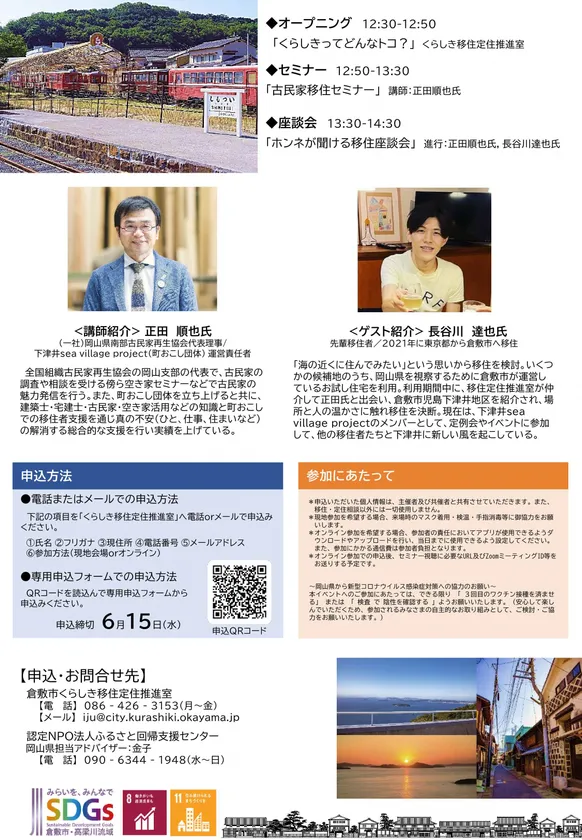 本セミナーでは、講師及び先輩移住者を招いて、倉敷市の魅力を発信するとともに、先輩移住者から倉敷でのリアルな生活を伝えることで参加者が抱く疑問や不安を解消し、移住へのファーストステップにつなげることを目的として開催します。