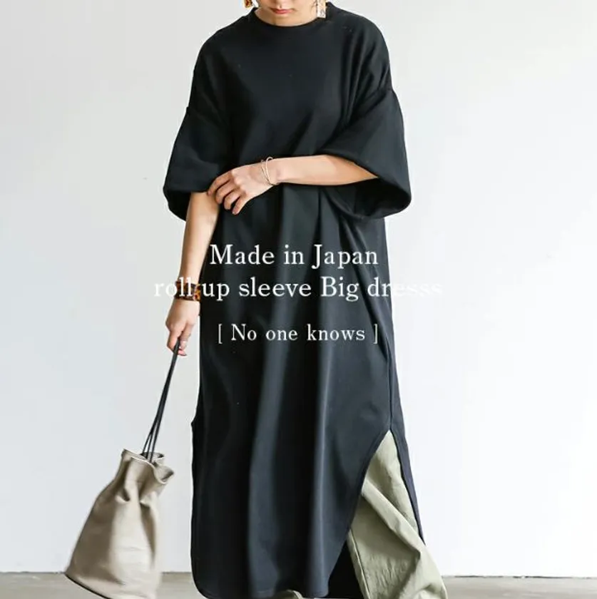 しっかりとしたジャージー素材を使用したカットソーワンピース。綿100%の薄手のスエット素材がラフな着心地で日本製なので安心感もあります。梅雨の足元が悪い中のお出かけでも深いラウンドヘムで足さばきが楽ちんで動きやすくなっております。大きなロールUPで二の腕が細く見えるのもポイントです。