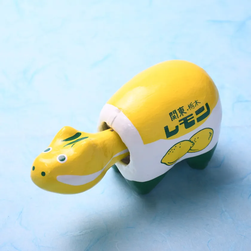 本商品は、栃木県を代表する乳飲料「レモン牛乳」のパッケージをモチーフに、約300年の歴史を誇る白河だるま総本舗が日本の伝統や優れた技術を活かし、ひとつひとつ職人の手によってつくりあげられた赤べこです。