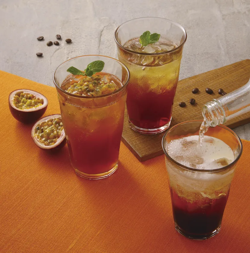 『アフリカンサンライズ』は、「パッションフルーツ」の果肉感と風味を存分に味わっていただける、夏にぴったりの爽快なシーズンドリンクです。今回は、「パッションフルーツ」の果肉、果汁、種を、上島珈琲店自慢のネルドリップマシンで抽出した「ネルドリップコーヒー」に、炭酸水を合わせて、トッピングにはミントをあしらいました。「パッションフルーツ」の芳醇な香りと鮮烈な酸味が、「ネルドリップコーヒー」と炭酸水との相性抜群で、爽快感のある大人のシーズンドリンクに仕上がっています。さらに、「パッションフルーツ」には、ビタミンが多く含まれ、抗酸化作用や美肌効果、貧血予防などの効果が期待されています。種は噛んで食感を楽しんでいただいたり、噛まずにのどごしを味わっていただいたり、色々な味わいをお楽しみいただきたい一杯です。