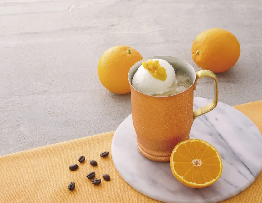 上島珈琲店の期間限定ミルク珈琲の中でも人気の高い「オレンジミルク珈琲」が今年も登場。6月~8月が旬の夏しか味わえない希少な「バレンシアオレンジ」の果汁をたっぷりと使用した上島珈琲店オリジナルシロップを「ミルク珈琲」に合わせて、大人の贅沢なミルク珈琲に仕上げています。「バレンシアオレンジ」にはビタミンCが豊富に含まれており、夏の元気の源になるようなドリンクです。トッピングのオレンジコンポートには、オレンジを皮ごと使用しており、ほろ苦く甘酸っぱい風味が絶妙なアクセントとなっています。味だけではなく、見た目も華やかで食感もお楽しみいただける、ワクワク感が詰まった一杯をお楽しみください。