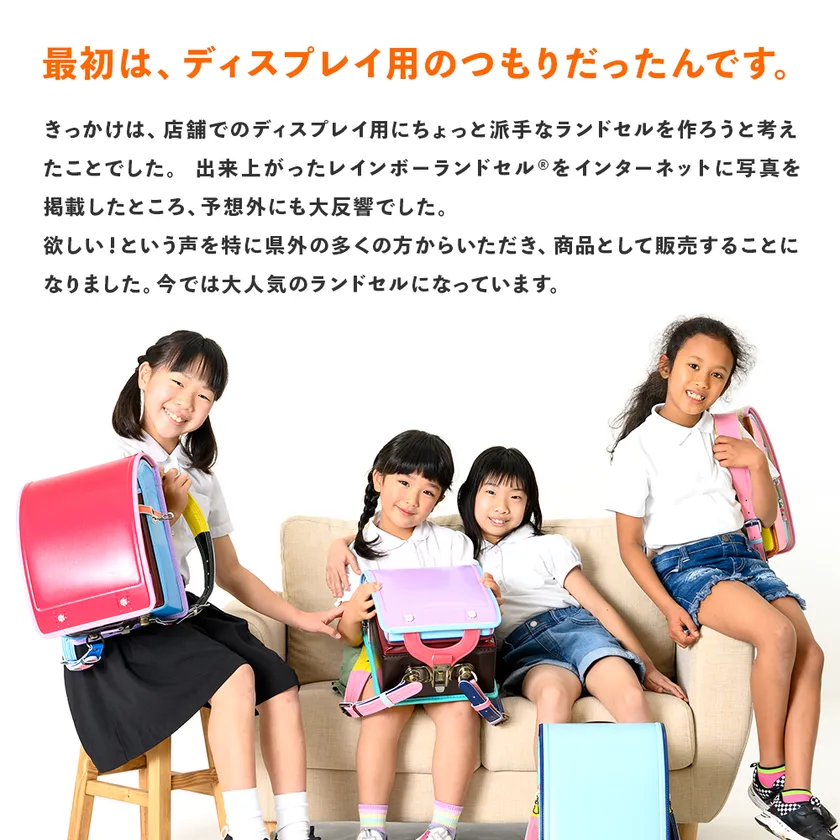 きっかけは、店舗でのディスプレイ用に、すこし派手なランドセルを製作したことです。出来上がったレインボーランドセルの写真をインターネットに掲載したところ、予想外の大反響を頂きました。特に県外の多くの方から「購入したい」という声をいただき、商品として販売を開始いたしました。