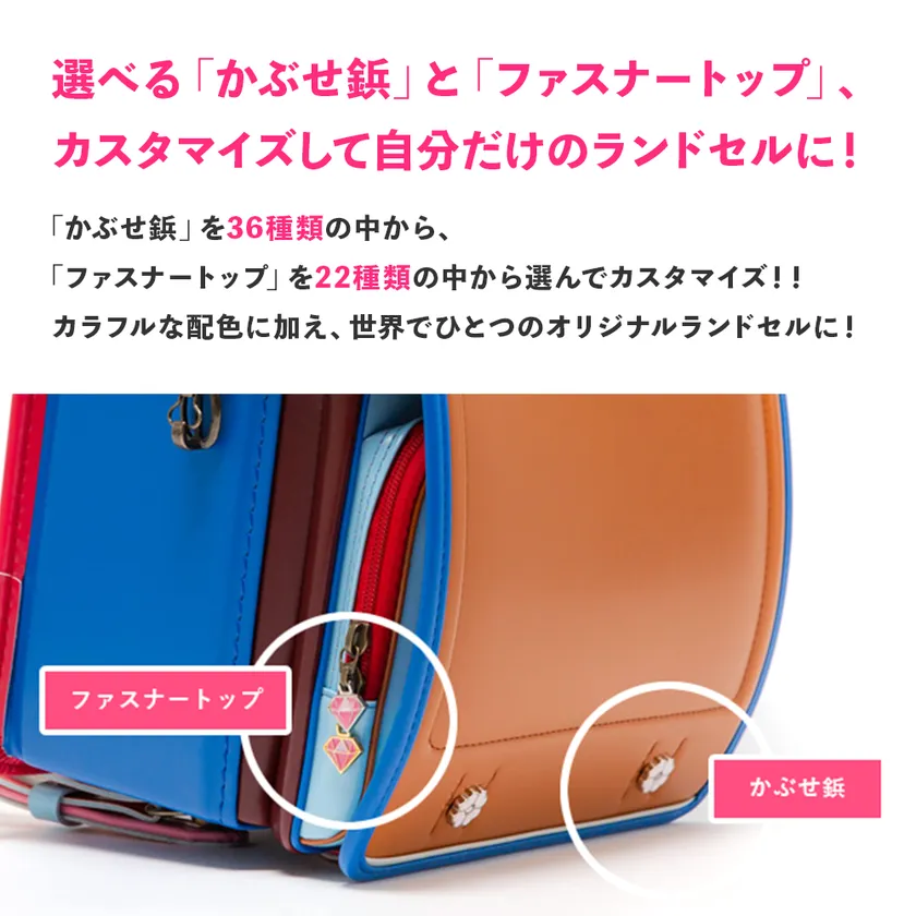 かぶせ部分は、キャメル・ベージュ・サックス・ビビットピンク・ラベンダーの5色の中から選べることができ、かぶせの鋲(36種類)やフャスナートップ(22種類)も選べます。6年間を楽しく過ごせるように、耐久性や機能性も抜群なので、カラフルなランドセルでお子様と一緒にたくさんの思い出を彩ることが出来ます。