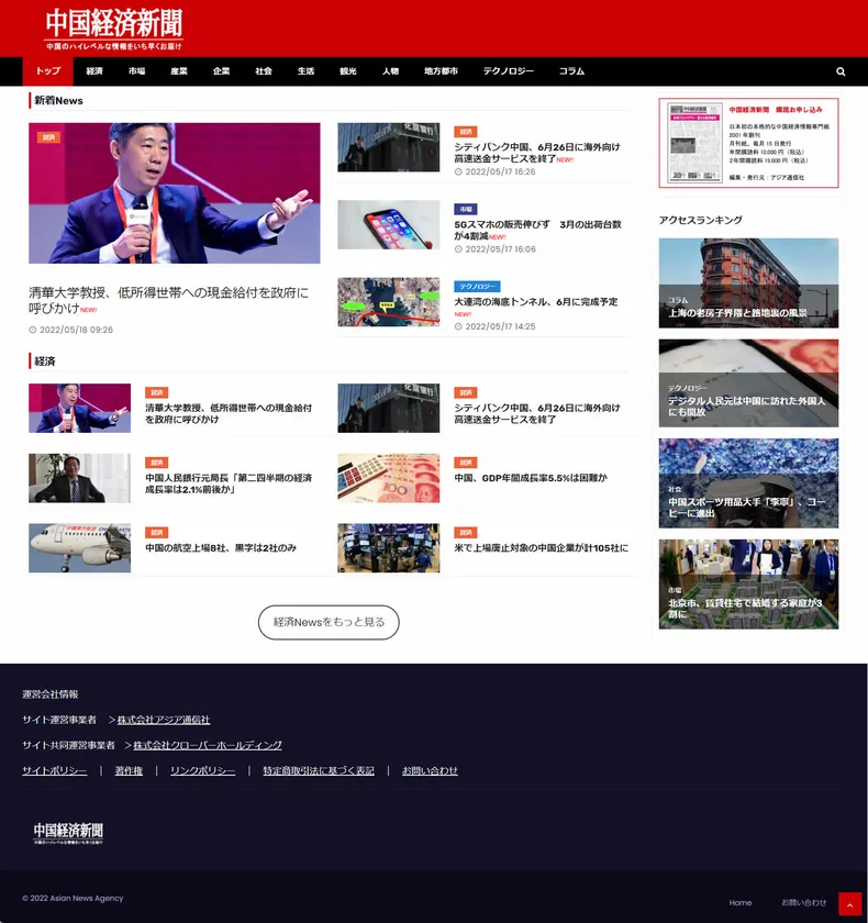 ソフトウェア開発、クラウドサービスを提供する株式会社クローバーホールディング(代表取締役CEO:武藤広文)は、月刊「中国経済新聞」を発行している株式会社アジア通信社(代表取締役:徐 静波)との事業提携にて、「中国経済新聞」のウェブ版(無料記事版)を2022年5月18日にリリースいたしました。