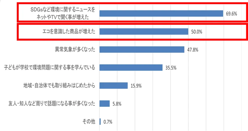 関心が高まったと思う理由については、「SDGsなど環境に関するニュースをネットやTVで聞く事が増えた」(69.6%)、「エコを意識した商品が増えた」(50%)という回答が半数以上、また、「異常気象が多くなった」(47.8%)も半数近くいるなど、普段の生活の中でエコや環境について触れる機会が増えていることも、きっかけとなっているようです。