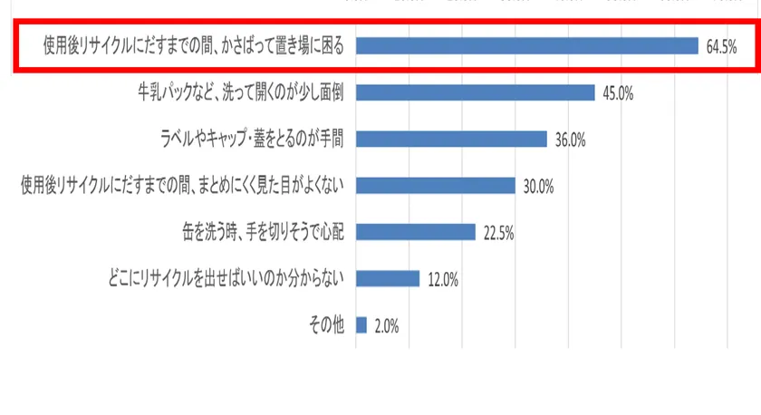 先の結果からも、容器のリサイクルに取り組んでいる様子がうかがえますが、飲食料品の容器について、リサイクルに出す際に感じることを尋ねたところ、6割以上の方が使用後リサイクルにだすまでの間、「かさばって置き場に困る」(64.5%)と回答し、リサイクルに出すまでの“かさばり”に悩んでいることも浮き彫りになりました。