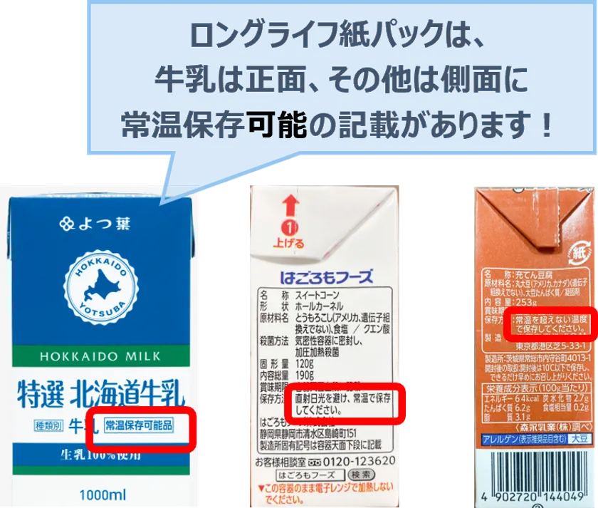 ロングライフ紙パックは、牛乳は正面、その他は側面に常温保存可能の記載があります