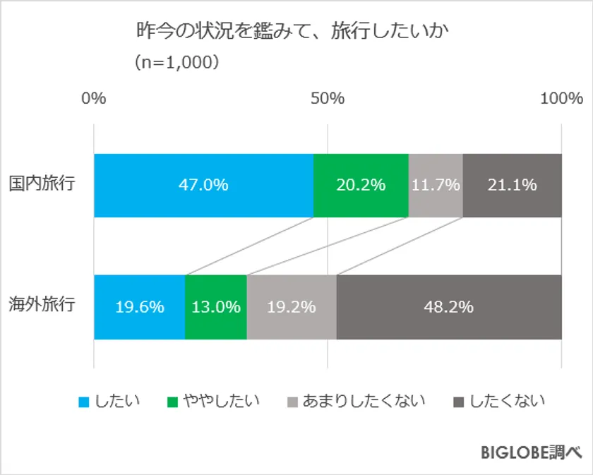全国の20代から50代の男女1,000人に「昨今の状況を鑑みて、旅行したいと思うか」と質問したところ、「国内旅行をしたい/ややしたい」と回答した人が全体の67.2%に対して、「海外旅行をしたい/ややしたい」と回答した人は32.6%という結果となった。