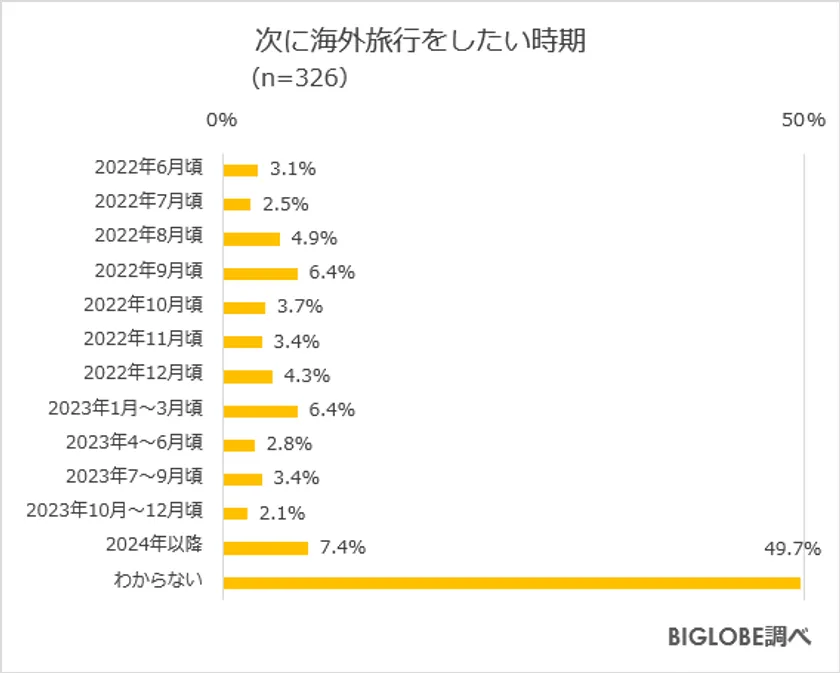 全国の20代から50代の男女1,000人のうち、「海外旅行をしたい/ややしたい」と回答した326人に「次に海外旅行をしたい時期」を質問したところ、「わからない」49.7%が最多となった。海外旅行をしたいものの、半数近くの人が具体的な予定は決めていないという結果となった。