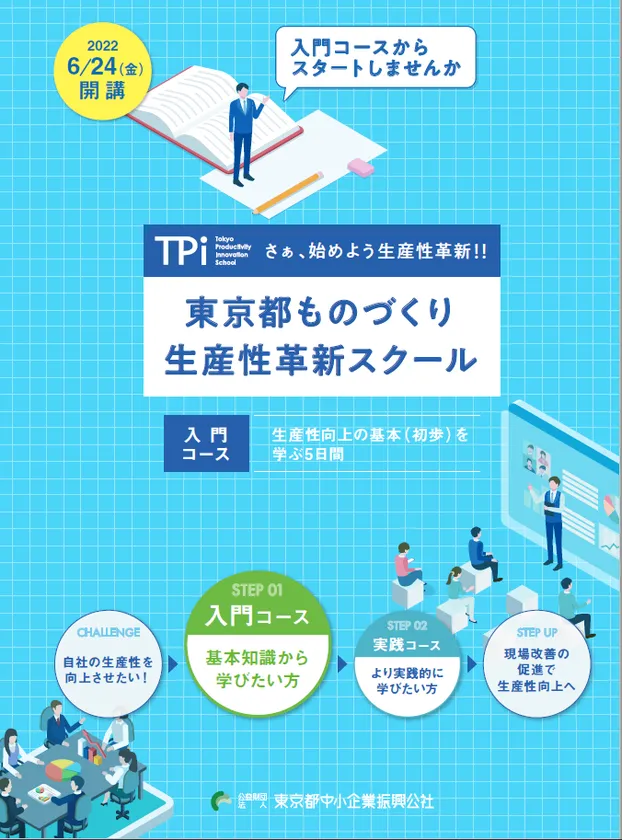 公益財団法人東京都中小企業振興公社では、中小製造業の生産性向上に向けた支援を行っております。この度、その一環として、中小製造業向けに『良い設計の良い流れ』を基軸として、QC・IE等の管理手法に機械保全を加え、広く生産性向上の初歩レベルを学ぶ『東京都ものづくり生産性革新スクール(入門コース)』を新規に開講します。