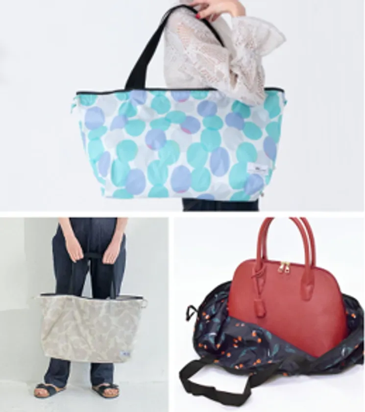 突然の雨から鞄をすっぽり覆って守ってくれるレインバッグカバー。撥水加工素材のバッグの下からお気に入りの鞄を被せてストッパーで固定するだけで、傘をさしても鞄が濡れてしまう心配も簡単に解決できます。おしゃれな柄で持ち手も付いているため、サブバッグとしても重宝しそうです。内側のポケットに小さく折りたためるコンパクトタイプなので、エコバッグとして鞄の中に常にスタンバイしても。