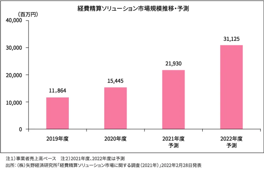 昨今、働き方改革によるペーパレス化、電子帳簿保存法対応などを背景に企業の経費・請求書領域のDX(デジタルトランスフォーメーション)のニーズが高まっています。矢野経済研究所の調査結果に示されている通り、経費精算システム市場は年々拡大しており、さまざまな業態や背景をもつ企業がシステムやソリューションを開発、販売しています。しかし、国内の大企業~中堅企業、あるいはグループ向けの業務にきめ細かく対応可能で、真に生産性の向上が期待できるソリューションは少ないのが現状です。