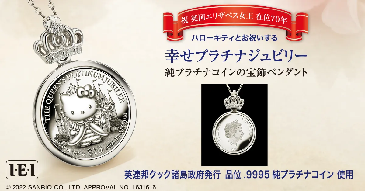 インペリアル・エンタープライズ株式会社(代表取締役社長:原 良郎、所在地:東京都荒川区)は、英国のエリザベス女王即位70周年を祝し、純プラチナコインの宝飾ペンダント<ハローキティとお祝いする幸せプラチナジュビリー>を、I・E・I オリジナルショップで販売開始いたします。