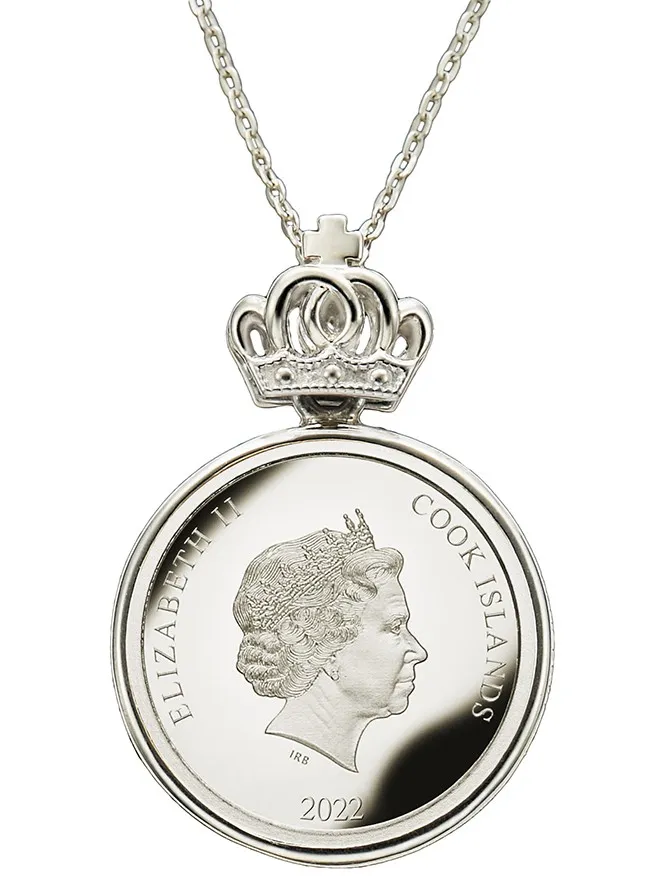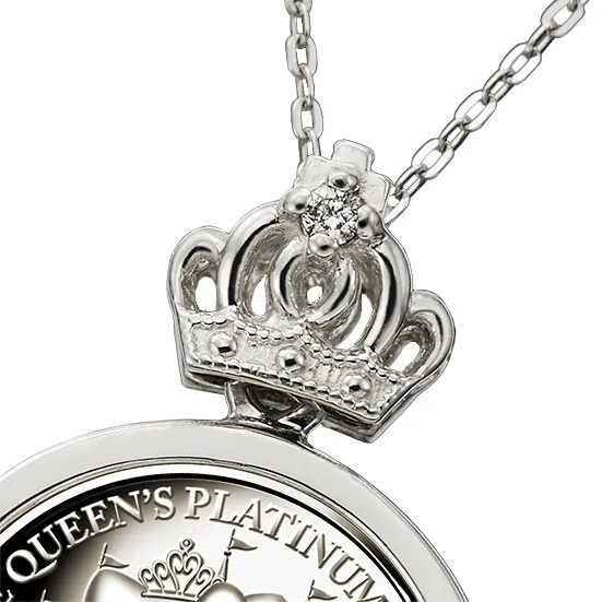 宝飾ペンダントは、どちらの面をおもてにしてもお召しいただけるリバーシブルタイプで、反対側の面にはエリザベス女王の公式肖像が。