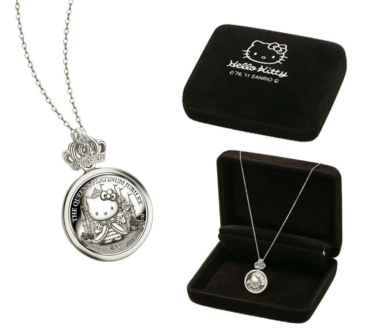 エリザベス女王即位70周年を祝し、純プラチナコインの宝飾ペンダント<ハローキティとお祝いする幸せプラチナジュビリー>新発売!