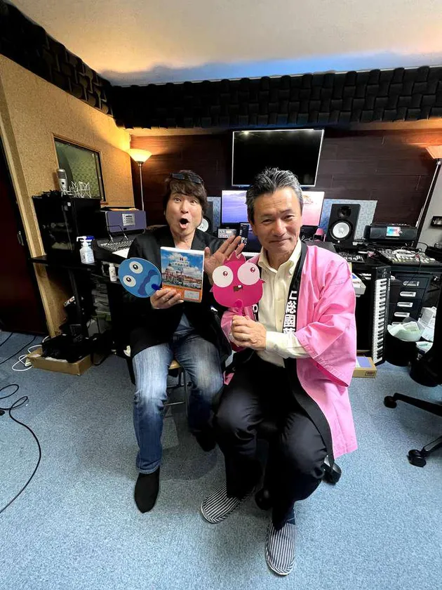 Upliveのグッズを持ってポーズを決める片岡英夫とパーソナリティーせんちゃん