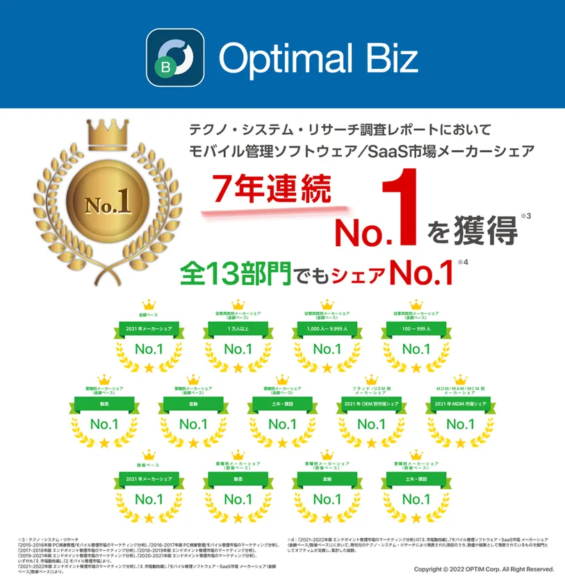このたび「Optimal Biz」は、本調査レポート「II.市場動向編」の「モバイル管理ソフトウェア・SaaS市場 メーカーシェア」2021年調査結果において、23部門中13部門でシェアNo.1※4の評価をいただきました。また、同調査レポートでは2022年の予測も行っており、同市場の「メーカーシェア」(金額ベース/数量ベース)においてNo.1であると予測されております。
