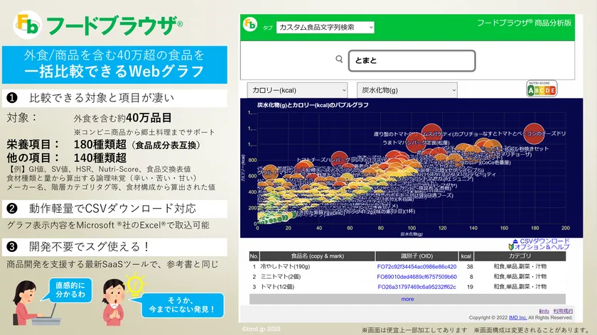 日本最大級(※1)の食品栄養データベースを提供する株式会社IMD(東京都港区・代表:峯尾 淳一)は、商品や外食・一般料理など40万件超の食品をグラフで一括比較できるツールを開発し、SaaS/Webサービスとして2022年6月10日(金)に提供を開始致しました。